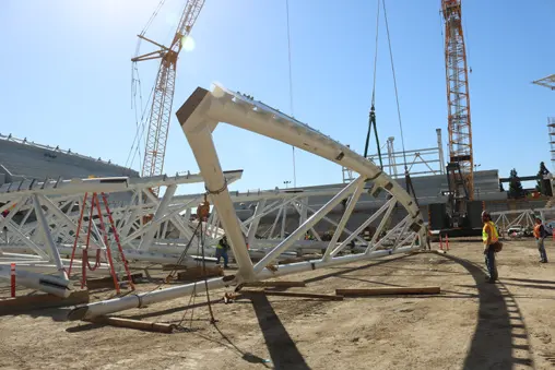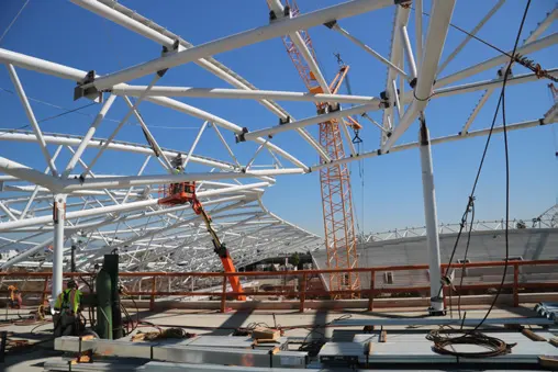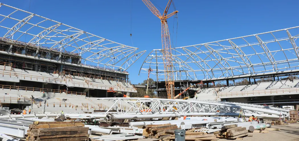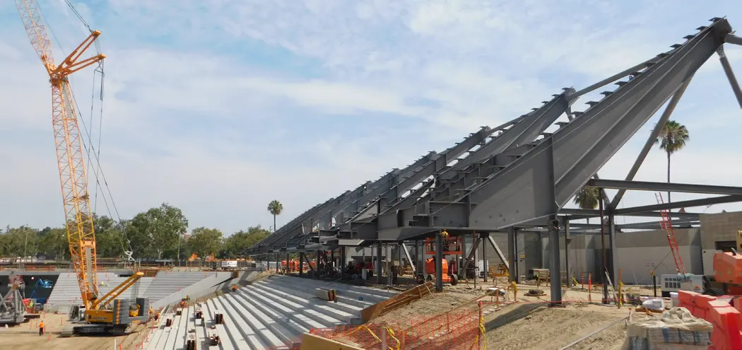 Banc of California Stadium, home of Los Angeles Football Club (LAFC), is a soccer-specific stadium and host for the 2028 Summer Olympics. The focal point of this structure is a 190,000 square foot roof canopy (complex geometrical rolled pipe, multi-beveled connection) which creates the backbone of this architectural masterpiece and encompasses five concourse levels, 35 box suites, terrace balcony, and 100,000 square feet of multipurpose space that is purposely shaped to retain the roar of the crowd. Built-up canopy members measure up to 120΄ in length and received a specialty multi-coat system. During the design assist process, stability of the rolled pipe members during fabrication was questioned which led to new cradles designed by our team and eliminated rollover risk — a serious safety concern. SME Steel was pleased to deliver this labyrinthine project on time and with ZERO lost time injuries.