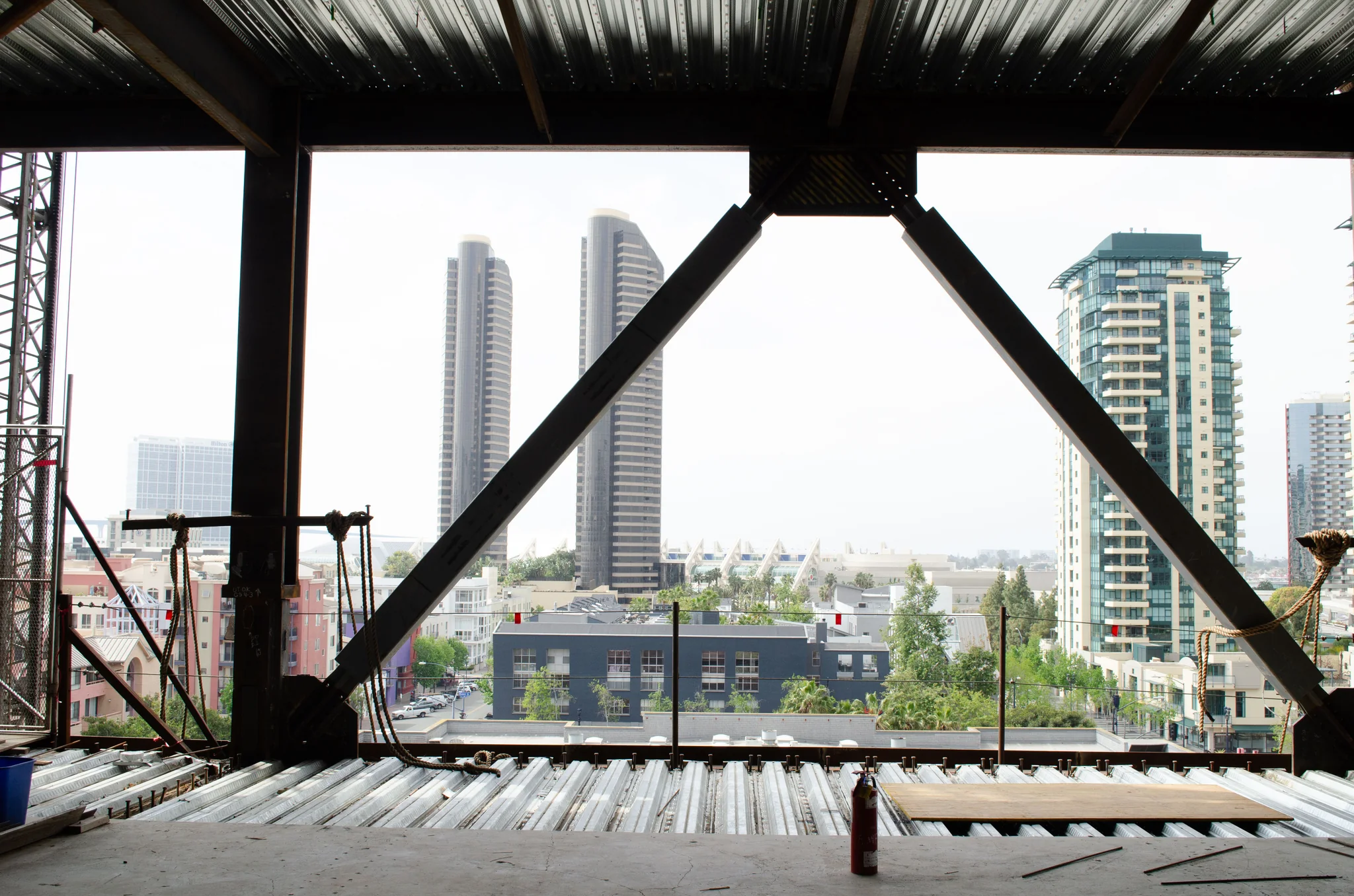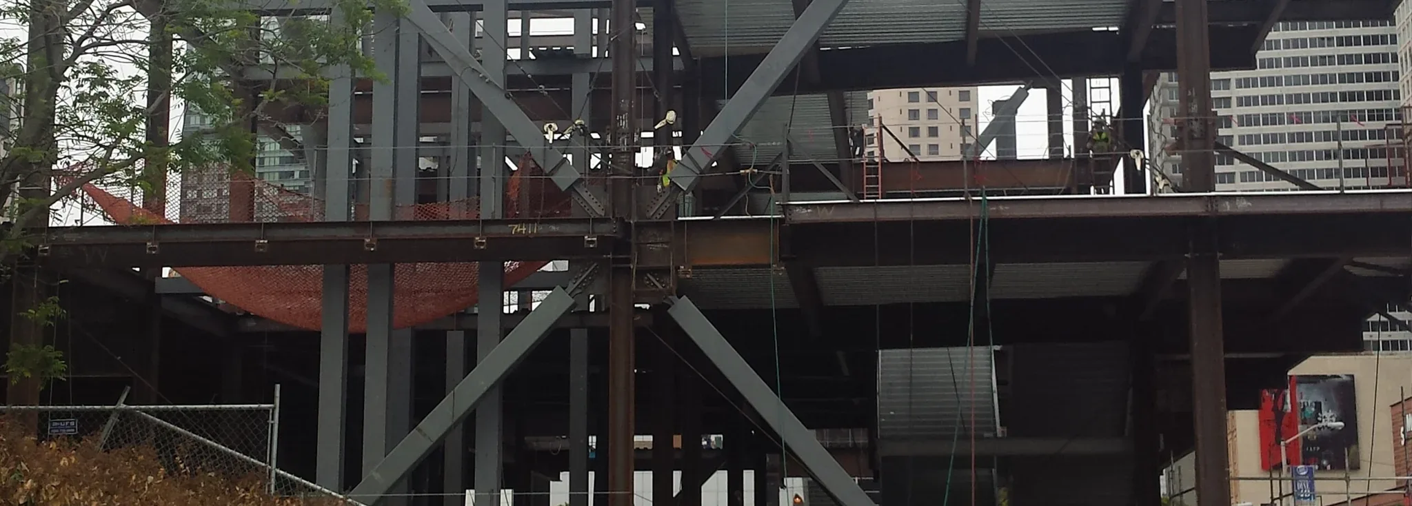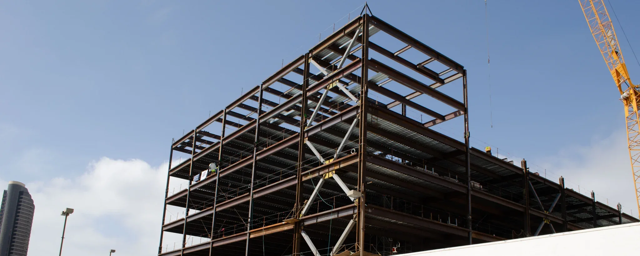 Steel beams with a city view in the background