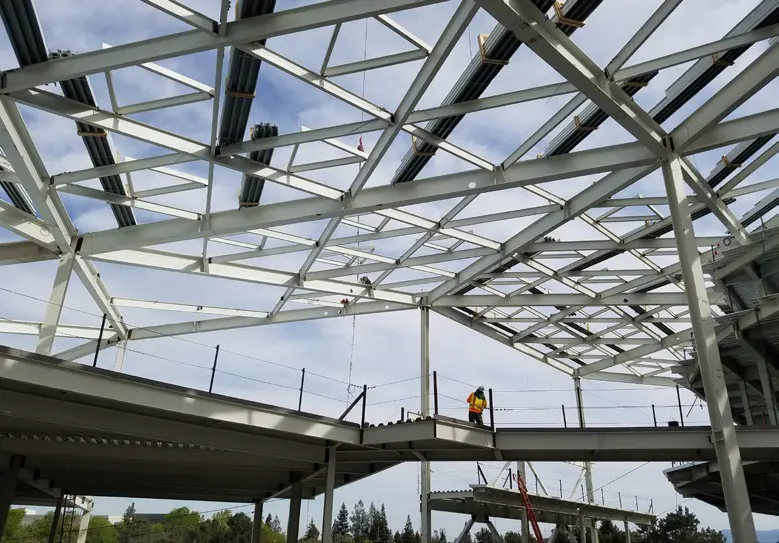 The unique and creative design for the NVIDIA Triangle is built to reflect NVIDIA’s core value of people as its greatest asset. Oversized platforms replace stairways as vertical connectors and double as space for impromptu meetings and interactions. The geometrical, polygon roof allows for large, vaulted spaces along with more intimate areas where private, focused work occurs. Additionally, the distinctive roof shapes, with constantly changing pitches, remind the viewer of the building blocks of computer graphics: the polygon. Strategically positioned skylights bring ample, diffused daylight into the building creating an efficient environment. Thirty-six 30˝ round steel drums float on top of specific columns to absorb seismic energy. Enormous, structural steel beams and columns provide the materials to make this unique structure a reality and coupled with SME Steel ingenuity and craftsmanship, make this project a success.